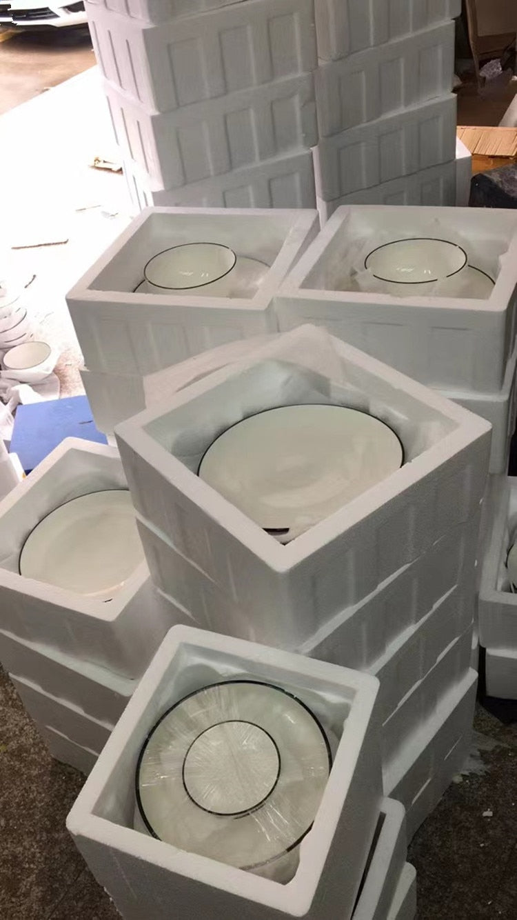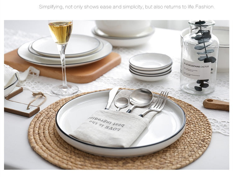 Achieving a modern and minimalistic aesthetic, this dinner set is crafted with fine white ceramic and trimmed with sleek black edges. Perfect for hosting guests or enjoying a meal at home, its design ensures a sophisticated look.