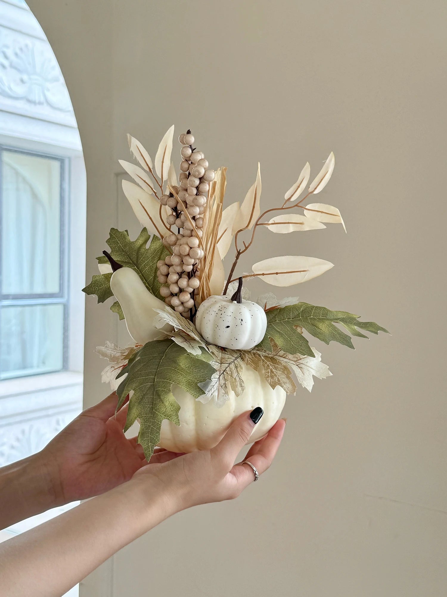 This autumn centerpiece is the perfect addition to your fall decor. Handcrafted with seasonal foliage and warm hues, it will bring a touch of natural beauty to any space. Add a cozy and inviting ambiance to your home with this unique centerpiece.
